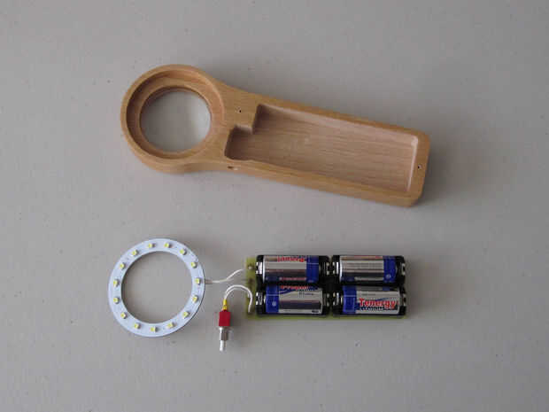Montaje de la lente en el mango. Para ello, aplique una capa delgada de pegamento epóxico catalizado a las paredes interiores de la manija donde se adapta la lente. Luego presione la lente en su lugar, teniendo cuidado de no conseguir cualquier epoxi en las superficies superior o inferior de la lente. (Si un poco epoxi entra en la lente, quítelo inmediatamente con alcohol isopropílico al 99%.) Deje reposar el conjunto manija y lente mientras que el epoxi se endurece.