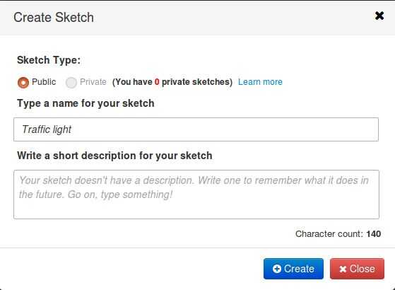 En codebender, iniciar sesión y comenzar con haciendo clic en el botón azul grande "Crear Sketch". Un popup aparecerá pidiéndole a nombre de su proyecto y agregue una descripción. Sólo el nombre "Semáforo" y haga clic en "Crear".