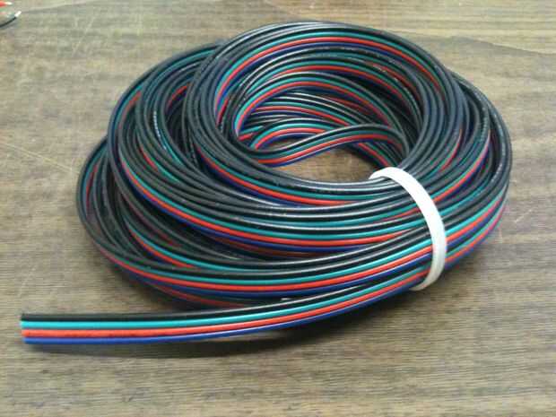 Necesitamos cable de 4 hilos para ejecutar desde las tiras de LED con el regulador/controlador. También usamos algunos de este cable para cablear el controlador RGB dimmer, etc.. Necesitamos conectar un nuevo cable a la caja del regulador/controlador. Queremos que los cables a ser desconectado fácilmente por lo que tendrá a algún tipo de terminación de cable o conector y terminal correspondiente o jack. Usé un conector que arrancó de algunos circuitos antiguos.