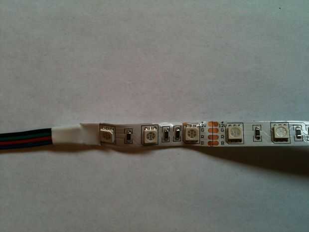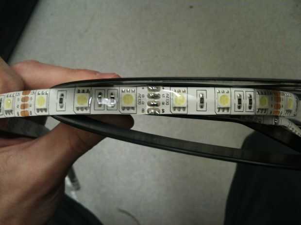 Las tiras de LED que pude encontrar son los 5 m de longitud que es cierto más que para este proyecto se requerirá. El costo no es grave. Pagué unos $13 enviados. Te recomiendo encontrar una tira de LED 5050 de como estos son más brillantes que el 3528. La otra gran diferencia es que en una tira de 5050's, cada chip tiene tres LED, rojo, verde y azul. En una tira de 3528 cada chip es rojo, verde o azul. Los colores de una tira de 5050 va ser mejor mezclados desde el componente que LED es mucho más estrechamente espaciados. También asegúrese de que el proveedor le envía la parte derecha. Los chips LED de verdadero RGB 5050 LED deben ser blanco. Si son amarillos, el proveedor te ha enviado una tira de LED blanco - no podrás cambiar los colores. Usted tendrá la opción de impermeable o no impermeable. Aquí utilicé una tira no resistente al agua pero impermeable podría ser una mejor opción y debería funcionar igualmente bien.