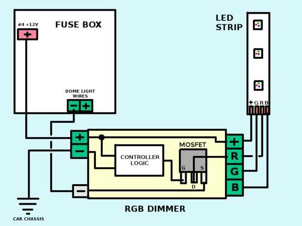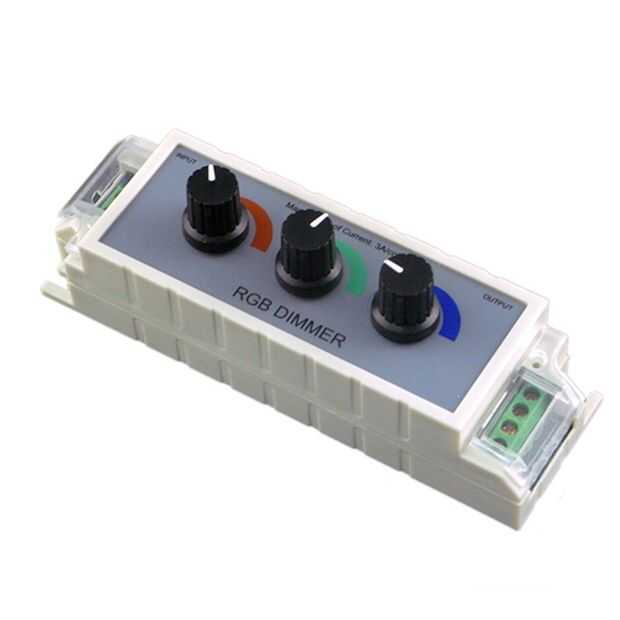 El regulador/controlador de LED RGB debe tener controles analógicos (perillas de potenciómetro), uno para cada canal. También es importante que la salida común coincida con la polaridad del riel común de las tiras LED. El controlador utilizado salidas un común + 12 V y tiene una planta individual para cada canal RGB. Las tiras de LED son también "ánodo común", lo que significa que tienen un + 12 V conexión y tres conexiones a tierra, uno para cada canal RGB.