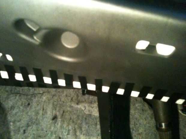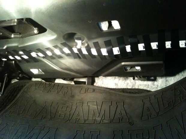 Usted tendrá que elegir una ubicación para el montaje de las tiras LED. Montara una tira en cada lado, el conductor y el pasajero. Les pegué en la parte inferior del vehículo ajuste donde el plástico negro en su mayoría era plano en toda la anchura de los pies. Una vez que la ubicación seleccionada, medir cuánto tiempo necesitará tus franjas y cortar tiras del tamaño adecuado de tu carrete de LED RGB de 5 m. La tira que he utilizado es capaz de cortarse cada 3 virutas, así que cada 2 pulgadas. Cuando usted corta la tira de usted lo hará por el medio de los conectores de cobre desnudos situado entre cada segmento. Mis dos tiras terminaron siendo de 14 pulgadas y 16 pulgadas de largo.