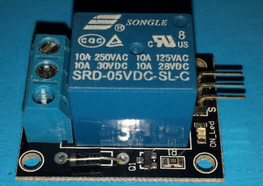 El relé de potencia srd-05vdc-sl-c de songle tiene tres pernos en un lado y tres terminales de tornillo en el lado opuesto.