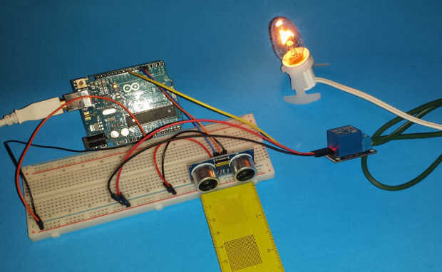 Una vez que verifique y carga el sketch en Arduino, enchufe el cable de extensión en el tomacorriente de CA, la luz se encenderá si se coloca un objeto a menos de 13 cm delante de la HC-SR04.