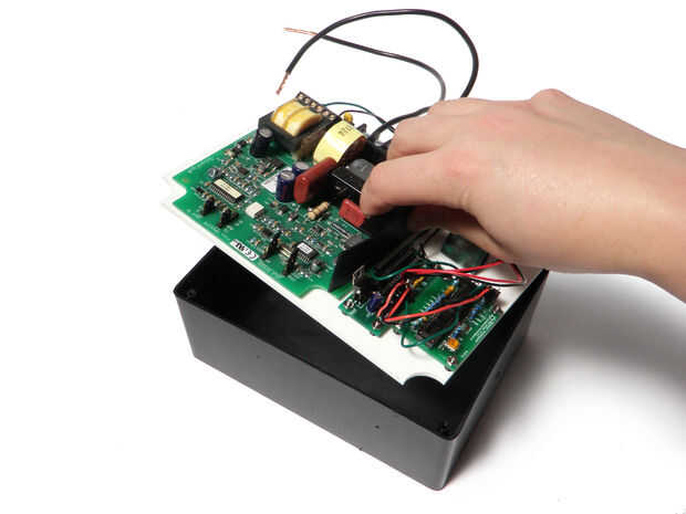 Inserte la base de acrílico en su recinto de proyecto que Arduino está más cerca de la parte con el agujero de 3/8".