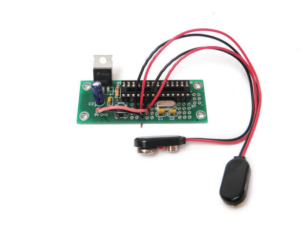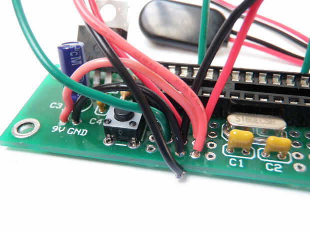 Suelde el otro extremo del alambre verde de toma en consonancia con el solo cable negro de la fuente de toma de corriente de 9V. Suelde el cable negro en consonancia con el punto central de las dos tomas de 9V. Por último, soldar el cable rojo con el cable rojo singular (que también está conectado a la tensión de entrada en la Junta de proyecto)