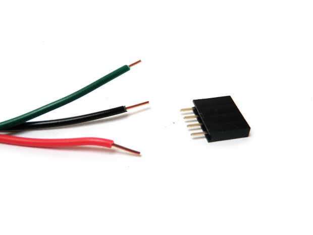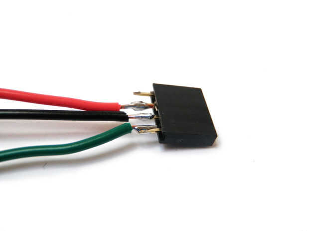 Soldar un cable 6" verde a uno de los pasadores exteriores del conector hembra. Soldar un cable 6" negro con el conector el cable verde y un 6" cable con el conector al lado del cable negro.