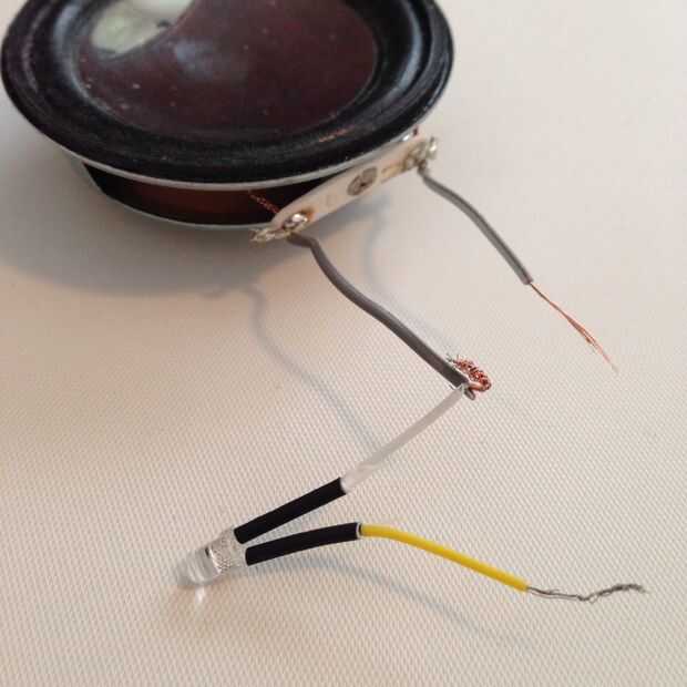Conectar un cable del Led a un conductor del altavoz. Dosis materia t que los cables porque utilizamos corriente alterna.