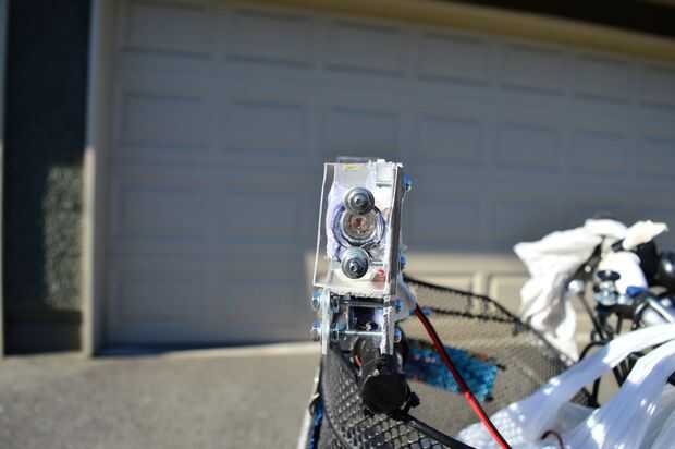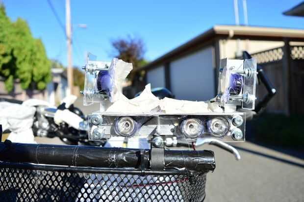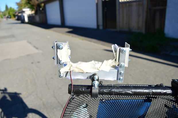 He montado en la luz de la bici en el suplemento de manillar de mi Instructable pasado. Cubrió los filos de la luz y los tornillos con pegamento caliente. Tuve que montar hacia el centro de la carretera para evitar el bloqueo de mi cámara en el manillar. También usé un faro Planet Bike en el lado de la acera para redundancia y visibilidad extra.