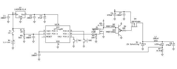 En este circuito, utilicé un controlador reductor de LED. Tensión de máxima regeneración de la resistencia de Isense fue 322mV que da una corriente de impulsión de 632mA cuando se utiliza una resistencia de ohm 0,51. Ya hay voltaje de ondulación, quería asegurarse de que la unidad actual no excede 700mA. La tensión de la cadena de LED sería entre 10V a 12V para cinco diodos luminosos amarillos. El voltaje de la fuente sería entre 13.2V y 16.8V dependiendo de la química de la batería y su estado de carga.