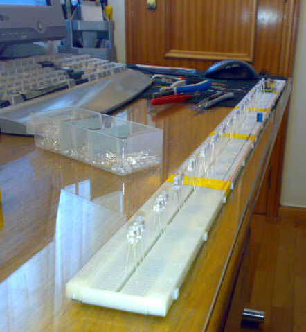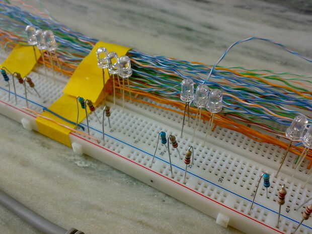 Después de diseñar el circuito, la construí en breadboards varios, para fines de creación de prototipos. Después de varias horas de cortar los cables y montar el circuito, obtuve este resultado: Un tablero gigante con 48 LEDs y toneladas de alambre!