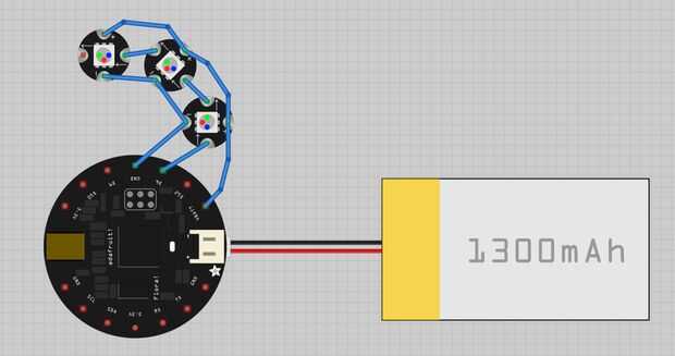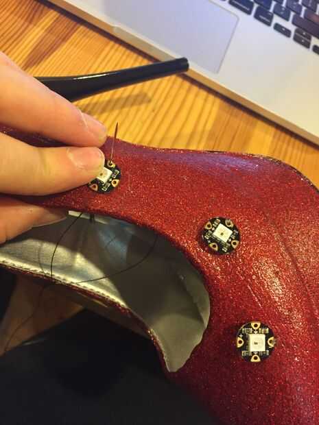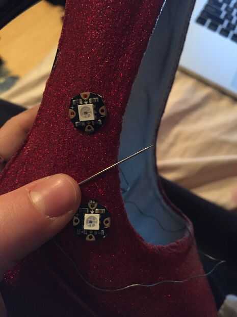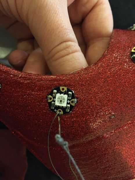 Usando el hilo conductor, coser cinco Adafruit NeoPixels a lo largo de la parte exterior de cada zapato. Puede iniciar desde la más abajo NeoPixel y trabajar su manera para arriba. Conectar a la alimentación, a la tierra, y las flechas de sentido. Fritzing del circuito por encima (gracias Adafruit!).