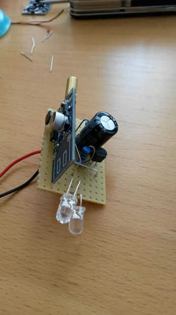 La batería es de dos baterías de AA en paralelo (1, 5V). He decidido ponerlos en paralelo porque luego es más fácil cambiarlos. Si usted tiene solamente una batería nueva el circuito funcionará con ella, pero solo la mitad siempre como con dos baterías.
