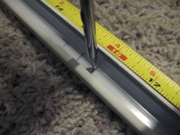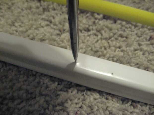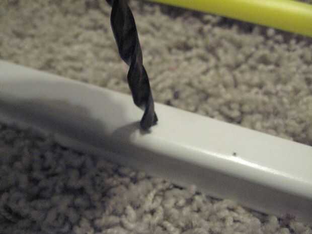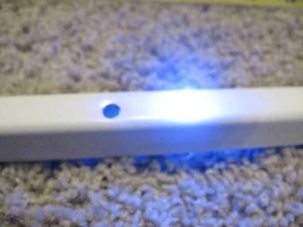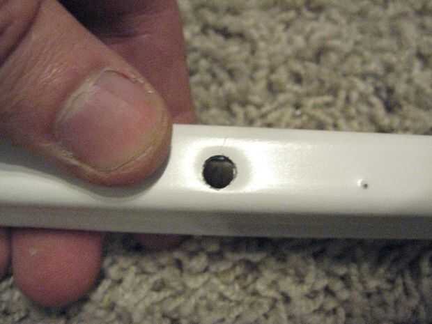 Voltee la barra, puso la lezna en la abolladura nuevo apuntando hacia ti y romper hacia abajo para dejar un hueco más grande (esto es gracias a la fatiga del metal). Golpear hasta que no haya agujero pequeño (menor que el ancho de un LED) y utilizar su 13/64" broca para limpiarlo.