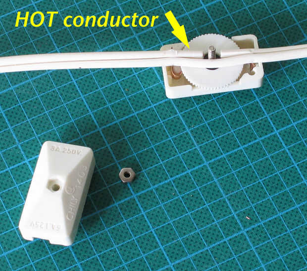 3. escoger un lugar en el cable que usted crea estará muy bien situado, quizás de 18 pulgadas desde el extremo que se conecta a la luz. En ese lugar, cortar el conductor de la punta estrecha e instale el interruptor. -PASO CRÍTICO
