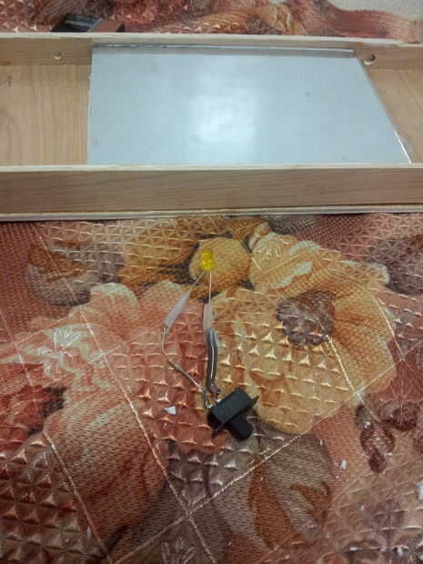 Hacer dos piezas de espuma que son un poco más pequeño que el tamaño del espejo y encolarlos. Luego pegar las piezas de espuma en la parte posterior del espejo. Poner el espejo en el centro de la parte superior.