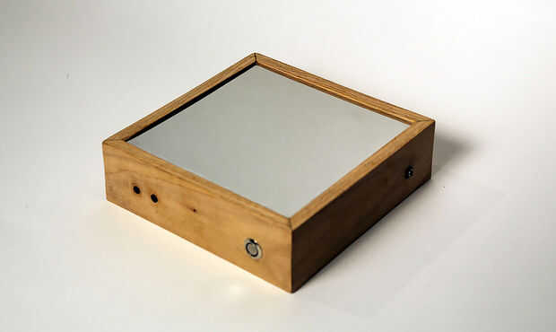 'La caja de luz' es un accesorio de escritorio de madera, diseñado para reaccionar a la música tocada y es ideal para los pads de la batería y DJ. compuesta de un marco de roble, la caja de música utiliza un Arduino Uno en combinación con un chip de MSGEQ7 y dos conectores de audio para aumentar la intensidad de su experiencia musical a través de una matriz de NeoPixels. Estos NeoPixels están ocultos bajo una cara de espejo, que actúa como un espejo cuando las NeoPixels fuera y actúa como un protector protector cuando las luces están en.