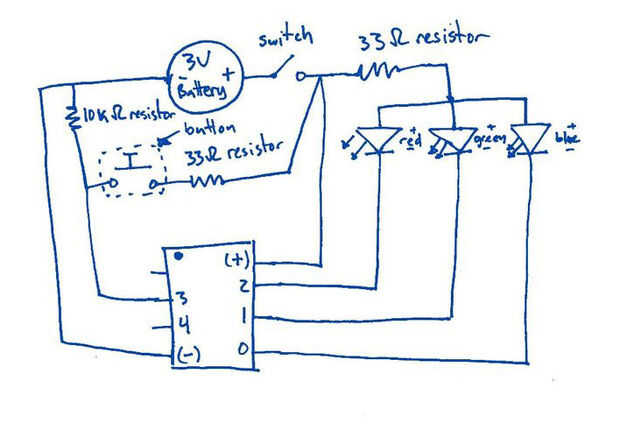 Este es el diagrama del circuito para el controlador de LED de calabaza. El LED es controlado por 0(blue), 1(green) y 2(red) de pins.