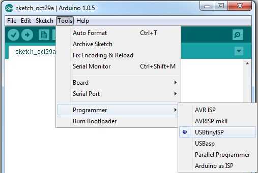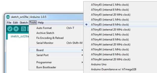 1. > Herramientas > tabla Seleccione el reloj ATTiny85 1 MHz