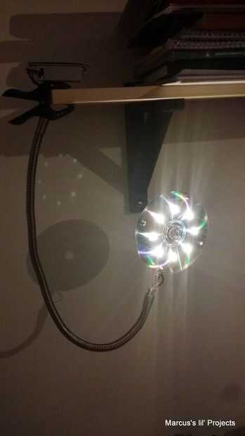 Se trata de un desklamp que hice para mi hermanita. Se hace sobre todo de desechos. Pueden fijarse a las placas horisontal (mesas, estanterías, etc.). La pantalla puede orientarse en cualquier dirección. El dispositivo es portátil, ya que el LED está alimentado por una batería de 9V (aunque mi hermana no quiere traer una pieza de desechos a la escuela cuando estudiaba).