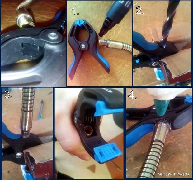 4. Pegar el brazo flexible a la abrazadera. Poner pegamento alrededor de la cavidad de la abrazadera y exterior alrededor del agujero. Pegamento caliente que no se recomienda porque es demasiado suave. Utilice pegamento de potencia o similar pega duro.