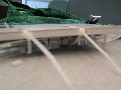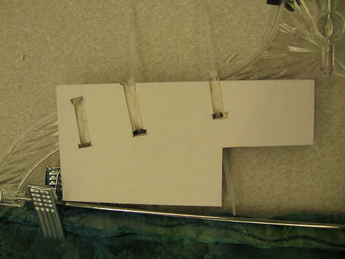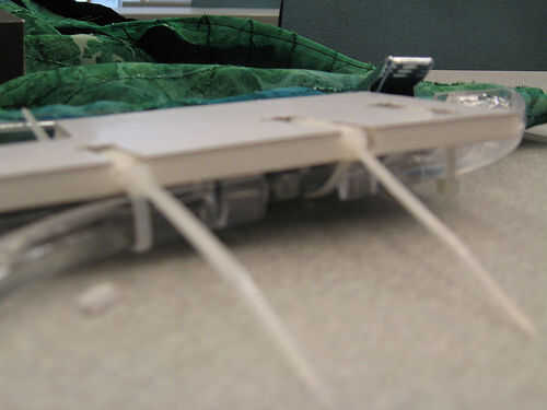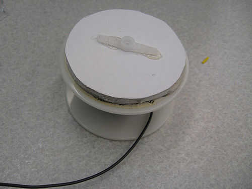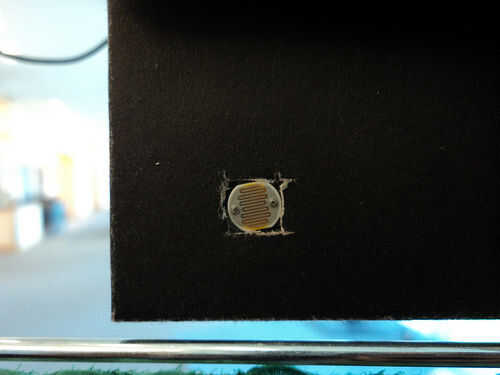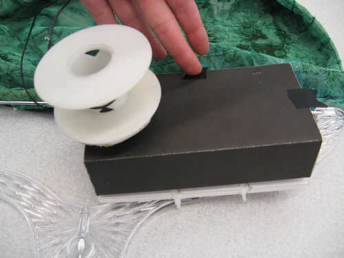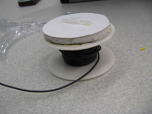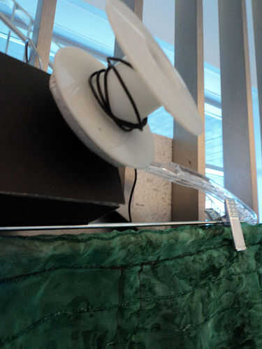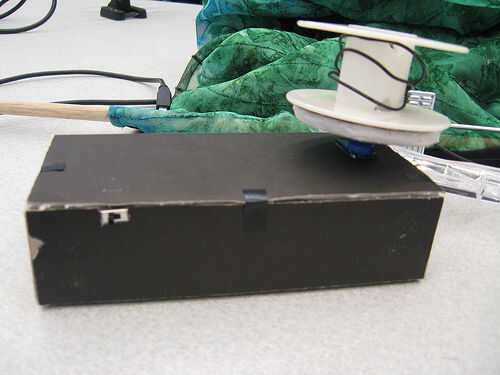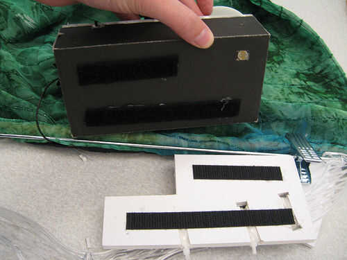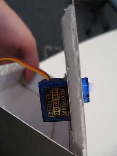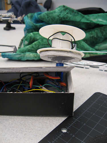 Hackeado un servo, por lo que fue capaz de girar completamente, hecho una caja fuera de la base de la espuma a la electrónica, la casa y hace un agujero en un lado así que la mayor parte del servo fue dentro de la caja con solo la parte que gira que se pega hacia fuera. Nos adjunta un carrete para arrollar el hilo en el servo, adjunto a continuación el cuadro entero a la percha que utiliza para demostrar nuestra cortina.