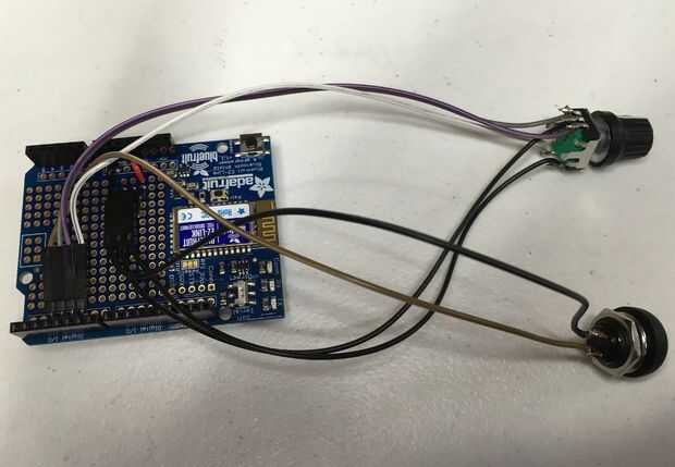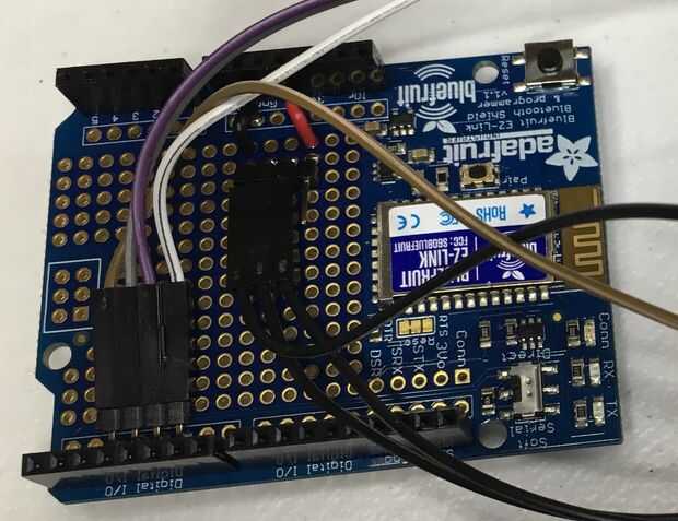 El área de prototipos del escudo de bluetooth se utiliza para conectar el botón momentáneo y el codificador rotatorio. Usé los pines de Arduino 2,3,4 y 5. 2 está conectado a un lado del botón momentáneo para que el bosquejo puede apagar el Arduino y despertar hacia arriba usando una interrupción de hardware a través de ese botón. (Resulta que la electrónica dibuja decenas de miliamperios de todos modos, pero en una iteración diferentes o para una aplicación diferente podría importa esto). Uno de los pasadores de codificador conectado a Arduino D3 para la funcionalidad de interrupción. La otra salida del codificador y el construido en botón momentáneo en el codificador están conectados a 4 y 5 respectivamente. El escudo de neopixel usa Arduino D6.