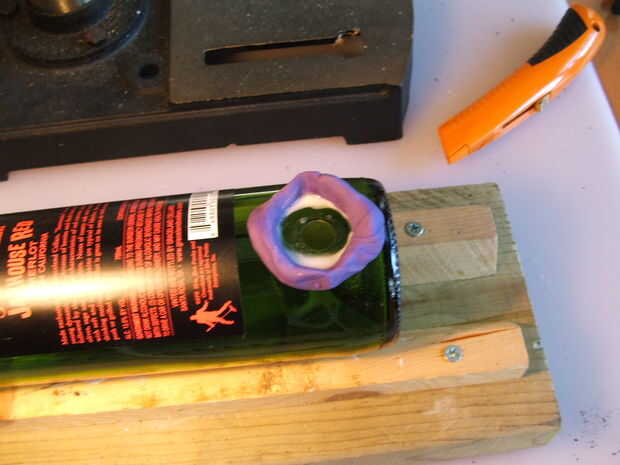 En algún momento (en mi experiencia, de 20 a 30 segundos es todo lo que necesita), el lubricante se cascada dentro de la botella, lo que indica que han perforado a través de la botella. Siga aplicando presión hacia abajo hasta que la sierra esté completamente a través de la pared de la botella. Poco a poco revertir la sierra cilíndrica de la botella y apague la prensa.