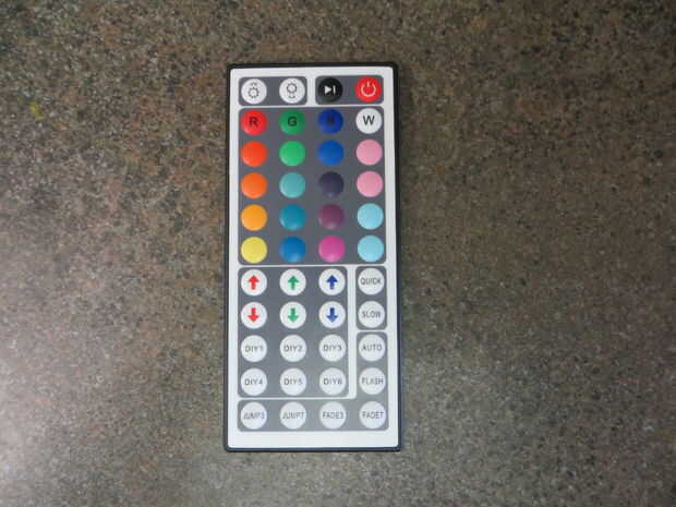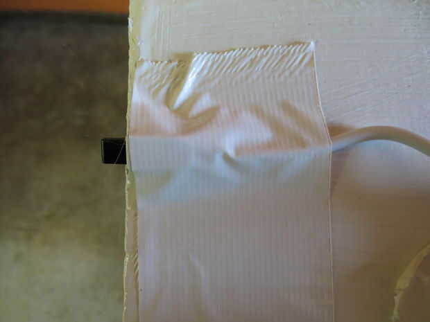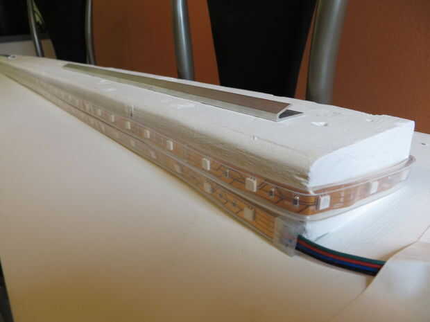 Estos LEDs vienen con un mando a distancia que funciona con RF que significa que el sensor de RF tiene que exponerse. Usé blanco cinta para fijar el sensor para que apenas asoma hacia fuera de la parte trasera de la placa frontal. También grabado la caja pequeña de corriente del sensor de RF a la Junta.
