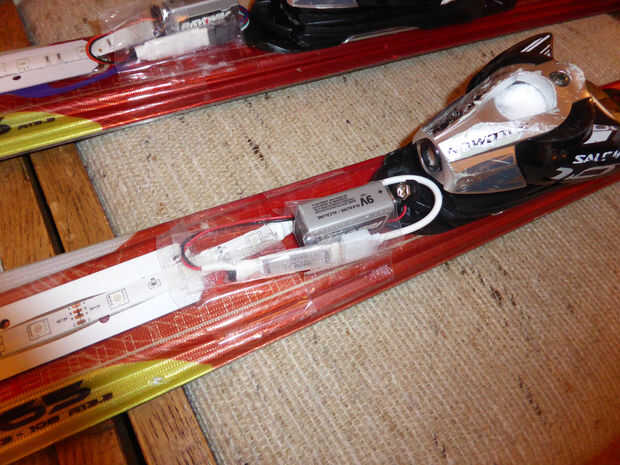 La parte difícil está actuando el cable de batería y cable de la tira de LED para que encaja perfectamente en el esquí. Usted necesitará utilizar la cinta de frío para mantener los cables sujetados.