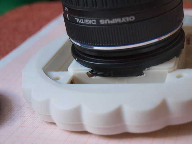 Utilizar la Dremel para cortar un surco pequeño debajo de los bordes que pueda soportar la luz del anillo en lugar de la lente.