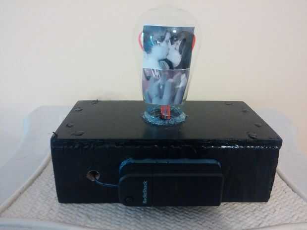 Rompió la parte inferior de la bombilla. Entonces tomó un pedazo de la suspensión y pegar una copia de una de las fotos de la boda a él. Entonces tomó algunos EL alambre formada un corazón lo pegado a la foto y la pieza del colgador. Luego agregué una foto de la esposa y me de besos y una foto de nosotros las manos que mostraron nuestros anillos.