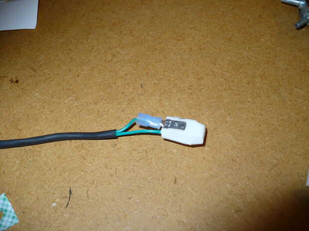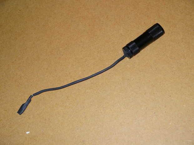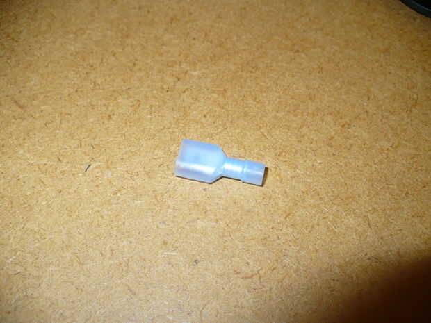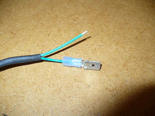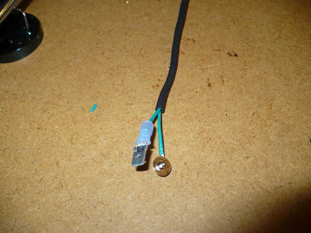 Ahora un conector macho de espada y quitar la protección de plástico de alrededor de la parte de espada. Luego lo doble al final de uno de los cables. Ahora recuperar el contacto redondo pequeño en el interruptor de la linterna (Recuerdas a mantener no te?) y la soldadura en el extremo del otro cable. (sugerencia, el extremo del cable en el agujerito en la parte posterior del contacto de la soldadura)
