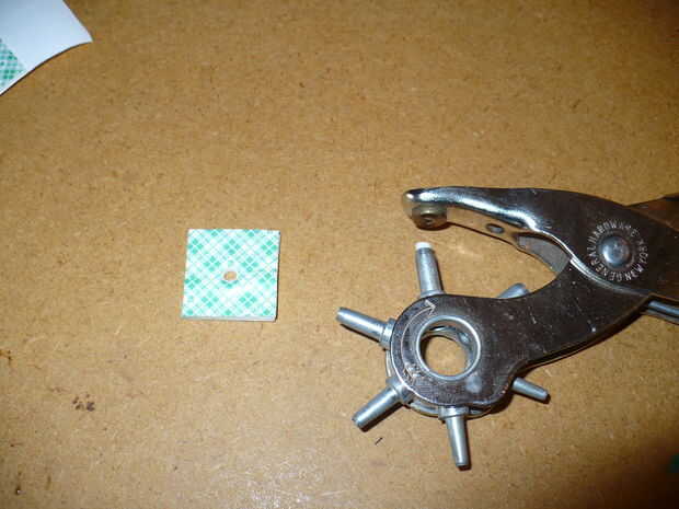 Ahora usaremos la cinta de montaje (el tipo doble del palillo con espuma en el medio) para separar los contactos hasta que se le aplica presión. Apilar juntos 2 o 3 piezas de la cinta de montaje. Necesitaba 3 pero puede que necesite más o menos dependiendo del grosor de la cinta. Luego use una perforadora para cortar un agujero en la pila de la cinta. Para probar para ver si la cinta es gruesa suficiente puede volver a montar la linterna y los contactos en la cinta. La espada irá en un lado y el contacto redondo va en el otro con la pequeña porción levantada en agujero en la cinta. La linterna luz no debe subir cuando los contactos se llevan a cabo en a suavemente, pero cuando se aplica más presión debe encenderse. Una vez tienes la piel buena la cinta para exponer el adhesivo y pegue los contactos en la cinta. Prueba otra vez el interruptor de la linterna.
