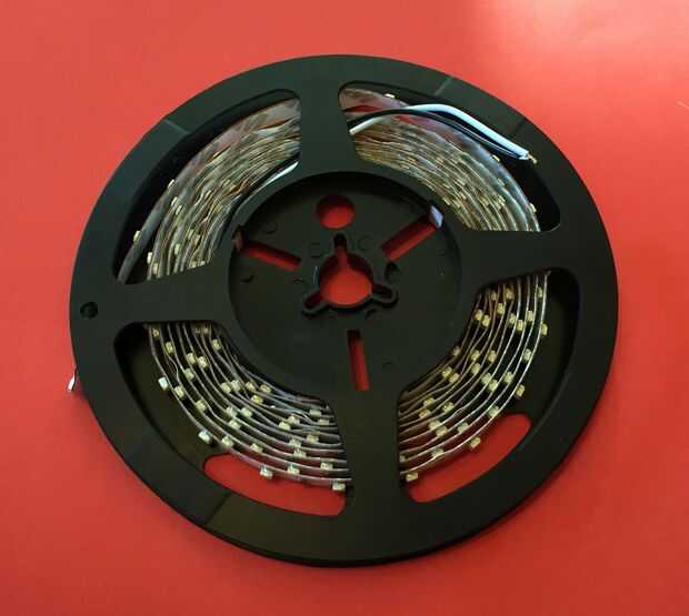 • LEDs - 3528 LED analógico de la tira. 300 LED en una tira de 5m (16,4'). Son LEDs de 12v DC. El link es de un blanco suave, pero puede prefieres blanco brillante . He recibido algunos comentarios que las luces cálidas dieron un tinte verde para la piel, por lo que terminó con dos calientes y dos franjas blancas brillantes. También hay tiras de LED 5050 y 5630. Ésos son más brillantes y más potencia. Las tiras de LED tienen forro adhesivo para el montaje fácil. Este sitio y este sitio tienen información buena comparando los tipos de LED.