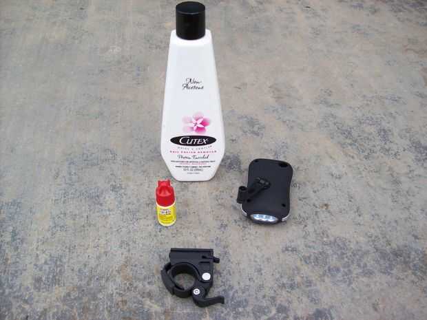1. dynamo light.... Puerto de carga, 2 por $8. 2. tensor correa luz... la mayoría tienen un tornillo para cambiar la base de montaje, se trata de una bicicleta de planeta 3. pegamento 4. removedor de esmalte de uña... o acetona