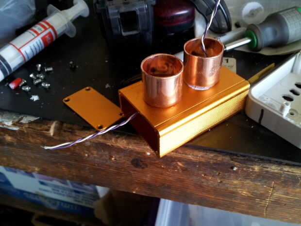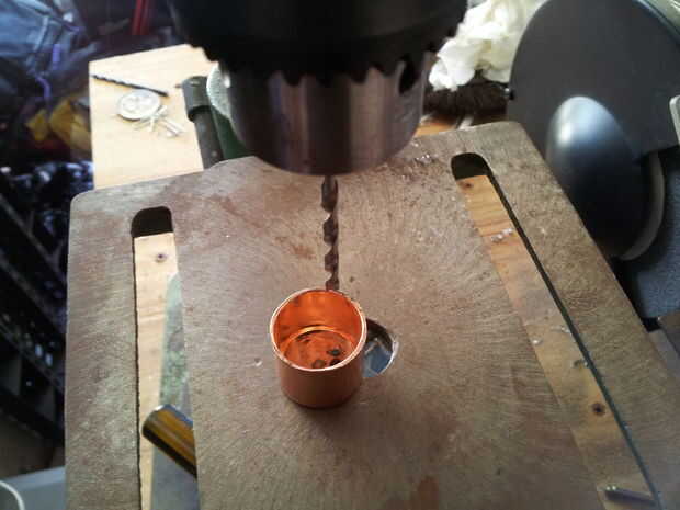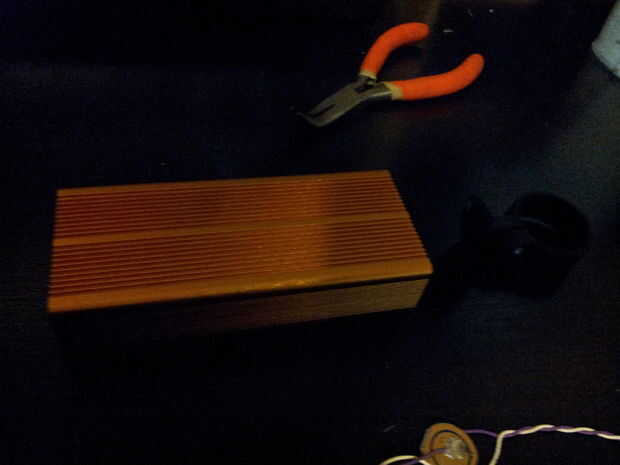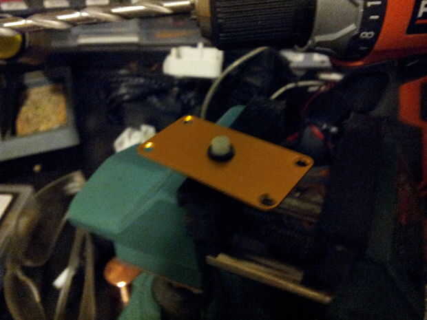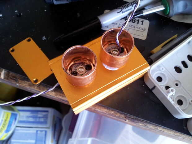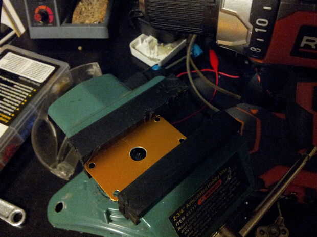Necesitará taladrar dos orificios en la parte posterior para el montaje de la abrazadera (robó de un cutre dólar 5 luz). Para cada enchufe de cobre con un led en su interior también necesita perforar 2 agujeros para los leds para atornillarse en la carcasa de aluminio. Necesita también dos pequeños agujeros para los cables. Necesitará taladrar un agujero en la placa superior para su conmutador y dos agujeros en la placa inferior de los cables de carga.