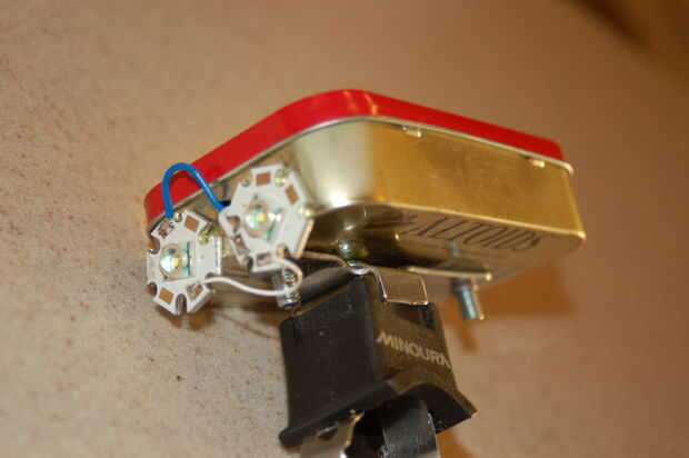 Epoxi se aplica a la parte posterior de los LEDs soldadas y sostenga en su lugar hasta que sólido. Ártico epoxi térmico es probablemente mejor que la caja Altoid actuará como un disipador de calor, pero he también utilizan epoxy de reparación doméstica estándar y no experimentado un recalentamiento con el Cree LED.