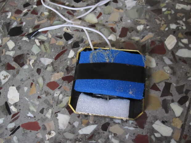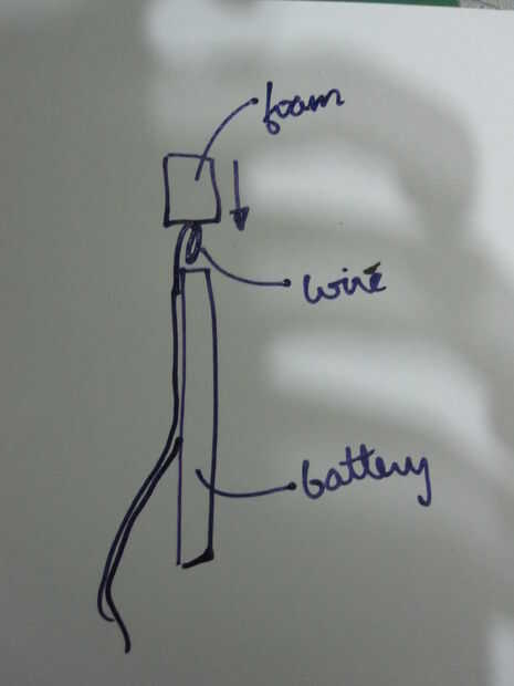 Para la fijación de la batería dos piezas rígidas de alambre se utilizaron para formar en dos lazos. Desde los terminales de la batería están empotrados en la batería, no puede utilizarse un simple alambre asegurado con cinta para enganchar los cables a él. Por lo tanto dos cables como se muestra en la mano diagrama dibujado puede utilizarse para conectar los cables a la batería, como te funciona similar a del resorte cargan contactos que están presentes en el teléfono. Con suficientes lazos de cinta y zip este arreglo es lo suficientemente estable como para soportar las sacudidas sufridas mientras que montar a caballo y se ha mantenido muy bien aunque saltando y en mal estado caminos.