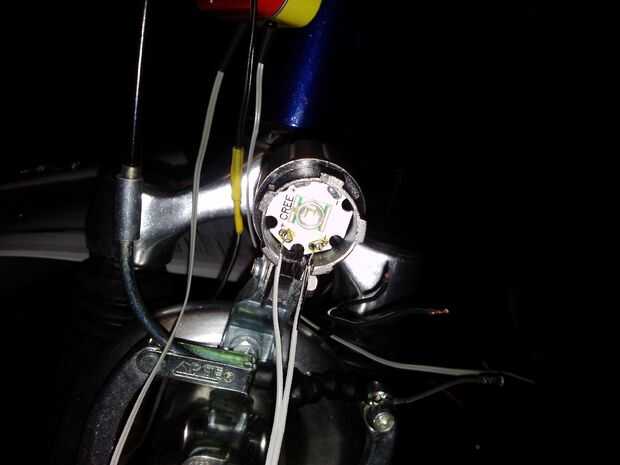El LED es soldado a la pareja designada cable saliendo de la caja. Además, el reflector de la luz de bicicleta antiguo necesita fijarse fuera y el blub viejo hay que eliminar para que el LED puede caber en la montura. Después de caliente-pegué una lente LED en la parte superior el Monte para enfocar el haz en un cono de aprox. 60-90 grados.