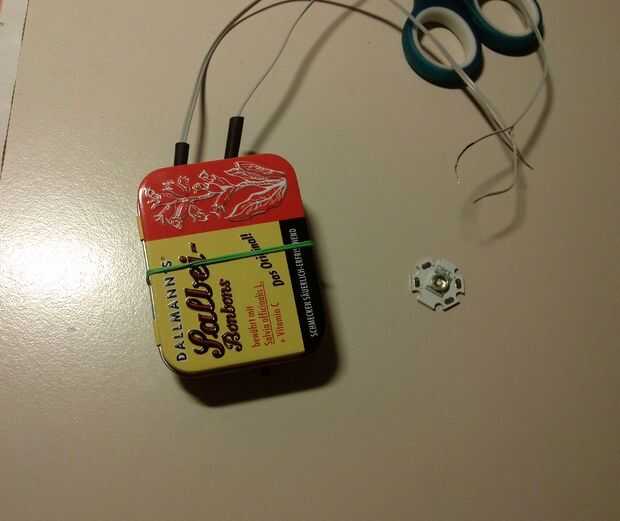 He decidido poner todos los componentes en una vieja caja de metal de caramelo que aisló desde el interior con cinta aislante. Primero perforé dos agujeros en la parte superior de la caja como los agujeros para los pares de dos cables que salen de la caja. Los agujeros deben ser lo suficientemente grande como para que un tubo de calor retráctil puede caber a través de cada agujero. A través de estos tubos ponemos las dos cadenas de cables y fijarlos con hotglue. Un par es la entrada de CA del generador, el otro par es + y -del LED (ver esquema).