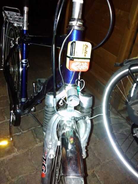 La caja sí mismo es además se mantiene cerrada por una banda de caucho y se fija a la bici al lado del auricular y la parte delantera del bastidor mediante el uso de correas de cable.
