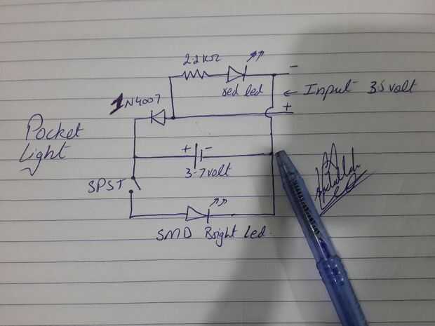 Con la ayuda de este esquema debemos construir nuestro circuito para luz de bolsillo.
