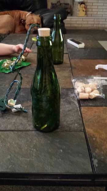 una vez en la última luz, inserte el corcho. puede que necesite una pieza de corcho de la muesca para caber en la botella con el cordón, compré corchos entonces un poco más pequeñas la apertura para esta versión.