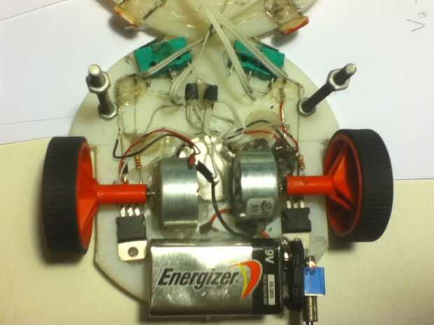 Así que ahora estamos en la diversión paso, pegué el circuito para el cuerpo con la pistola de pegamento caliente, también añadí las ruedas a los motores que lo utilizan. Pegué las LDRs al círculo superior del cuerpo, como se muestra en la imagen de abajo. Después pega todo lo tendrás que poner en los tornillos para cerrar el cuerpo del robot...