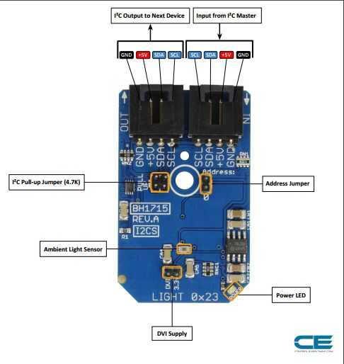 La BH1715 de trabajo I2C. Aquí está el esquema del ejemplo, demostrando cómo cablear cada interfaz del sensor.