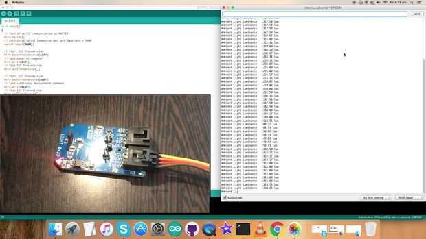 unsigned int data[2]; // Request 2 byte of data Wire.requestFrom(Addr, 2); // Read 2 bytes of data // ALS msb, ALS lsb if(Wire.available() == 2) { data[0] = Wire.read(); data[1] = Wire.read(); } delay(300); //convert the data float luminance = ((data[0] * 256) + data[1]) / 1.20; // Output data to serial monitor Serial.print("Ambient Light Luminance :"); Serial.print(luminance); Serial.println(" lux"); Todo lo que necesita hacer es grabar el código de arduino y verificar su lectura sobre el puerto serie. La salida se muestra en la foto de arriba también para su referencia.