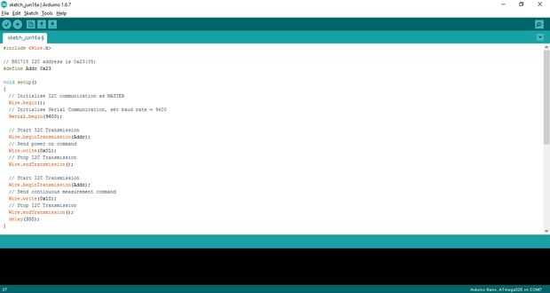 // Initialise I2C communication as MASTER Wire.begin(); // Initialise Serial Communication, set baud rate = 9600 Serial.begin(9600); // Start I2C Transmission Wire.beginTransmission(Addr); // Send power on command Wire.write(0x01); // Stop I2C Transmission Wire.endTransmission(); // Start I2C Transmission Wire.beginTransmission(Addr); // Send continuous measurement command Wire.write(0x10); // Stop I2C Transmission Wire.endTransmission(); delay(300);
