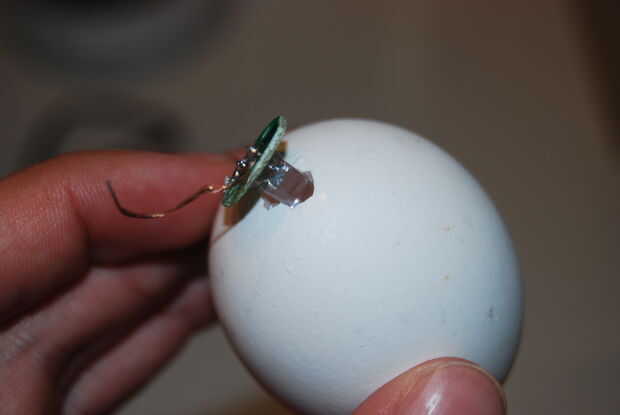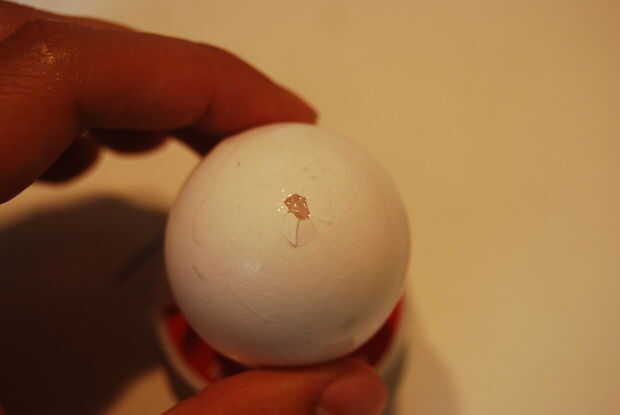 Hacer un agujero más grande en el extremo de la grasa del huevo (hacerla lo suficientemente grande como para caber el LED adentro. Empuje la aguja dentro y un poco swing alrededor allí para romper el yugo y mezcla las cosas un poco.