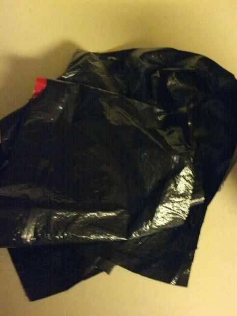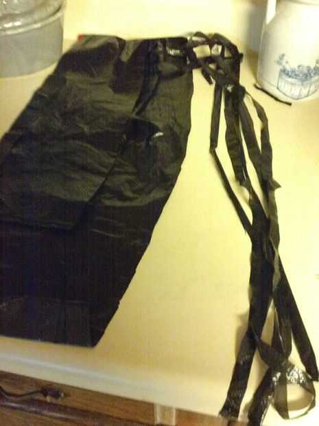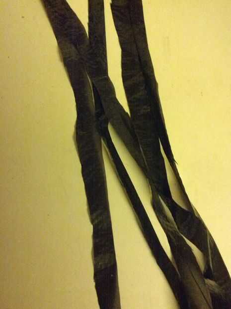En este paso usted puede salir y comprar plástico rosca... la clase hecho carteras con cuando éramos niños o---hacer igual si no quieres gastar dinero ant. Corté tiras de 1 pulgada de una bolsa de basura que tenía debajo del fregadero que había usado antes para poner encima una capa de invierno almacenados. A ver... no es acaparador si consigue reutiliza jeje. Corté tantas tiras largas como pude. Mi bolso es un resistente uno. No se recomienda utilizar bolsas endebles super baratos. Bolsas de supermercado negro estaría bien también.